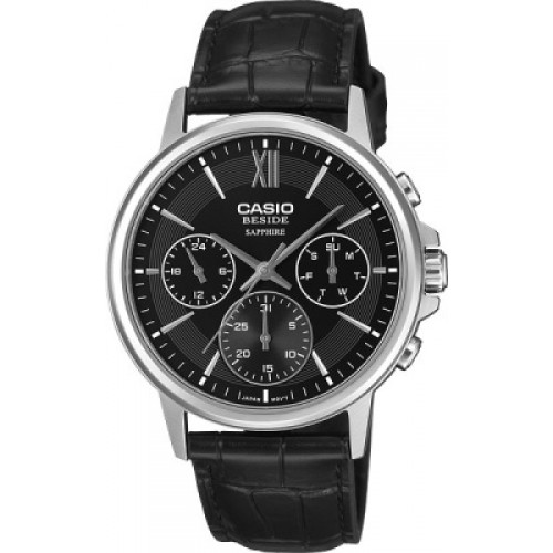 Японский кварцевый механизм. Центральные часовая, минутная и секундная стрелки. Точность хода не хуже от -10 до +20 сек. в месяц. Стрелочный указатель даты. Стрелочный указатель дня недели. Стрелочный указатель времени суток с 24-х часовой шкалой. Сапфировое стекло устойчивое к царапанию. Корпус из стального сплава 316L с высокими антикоррозийными свойствами. Водозащита до 5 АТМ. Кожаный ремешок. Простая ремешковая застежка.