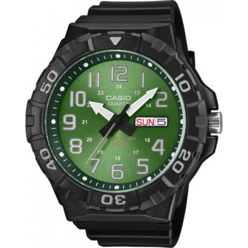 Мужские кварцевые часы с центральными стрелками часов, минут и секунд. В позиции 3 часов — окно даты и дня недели. Выбор формата времени: 12/24 часа. Циферблат зелёного цвета с арабскими цифрами. Использование светоотражающего покрытия. Корпус из чёрного полимерного материала. Заводная головка с защитой. Чёрный ремешок из полимера, с классической застёжкой. Стекло — акриловое. Класс водонепроницаемости — WR 100 (подходит для плавания без ныряния). Вес изделия — 61 г.