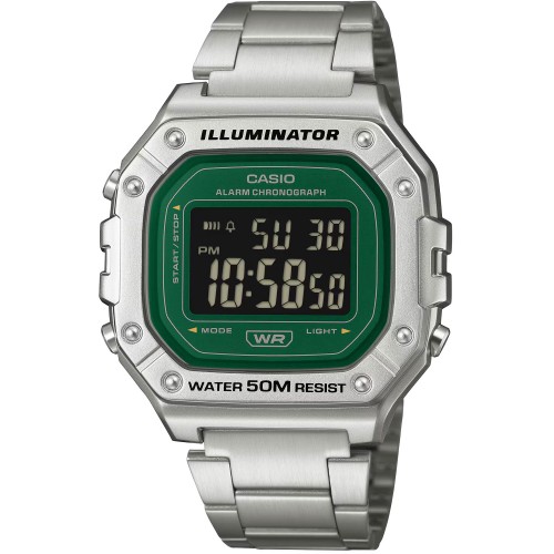 Мужские электронные часы с подсветкой в янтарном оттенке. Секундомер с разрядностью 1/100 секунды и максимальным временем измерения — 1 час. Ежедневная функция будильника, звуковой сигнал каждый час. Выбор формата времени — 12/24 часа. Автоматический календарь. Циферблат зелёного цвета, дисплей — чёрный ЖК. Корпус изготовлен из полимерного пластика. Стальной браслет, тройная раскладная застёжка. Стекло — акриловое. Защита от влаги — WR 50 (подходит для мытья рук, дождя). Вес — 85 г. Срок службы батарейки — 7 лет.