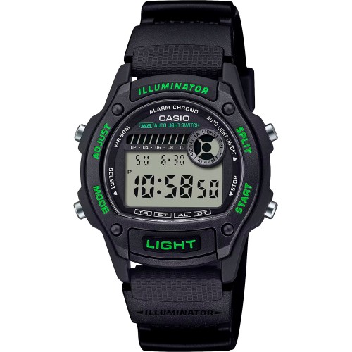 Электронные часы. Светодиодная подсветка. Секундомер с точностью показаний 1/100 секунды и пределом измерения - 24 часа. Таймер. Ежедневный будильник. Автоматический календарь. Серый цифровой дисплей. Круглый корпус выполнен из черного полимерного материала. Полимерный черный ремешок, стандартная застежка. Акриловое стекло. Водостойкость WR 50 (мытье рук, дождь).