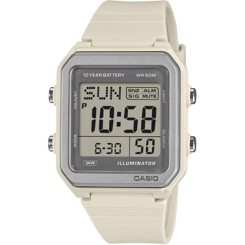 Мужские электронные часы с подсветкой на светодиодах, настраиваемой по продолжительности (1,5 или 3 секунды), с эффектом послесвечения. Цвет подсветки — янтарный. Вибро-сигнал при активации будильника, ежечасного сигнала и таймера. Функция мирового времени — 29 часовых поясов, 48 городов. Секундомер с точностью до 1/100 секунды и максимальным временем измерения 24 часа. Таймер на 24 часа с автоповтором. Три настраиваемых будильника, один из которых поддерживает повтор. Ежечасный сигнал. Выбор формата времени — 12/24 часа. Автоматический календарь до 2099 года. Режим включения/выключения звуков кнопок. Циферблат — серый, ЖК-экран — серый. Корпус — из полимерного пластика, ремешок — из полимера, стандартная застёжка. Стекло — акриловое. Устойчивость к влаге — WR 50 (подходит для мытья рук, дождя). Вес — 35 г. Срок службы батарейки — 10 лет.