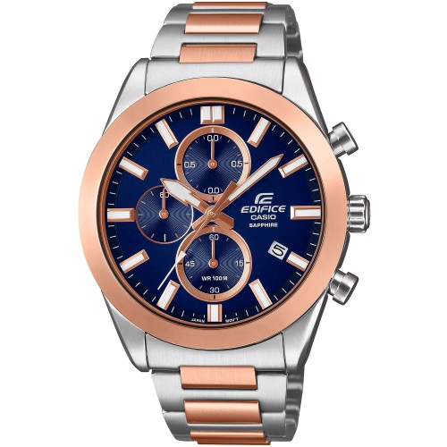 Стильный мужской кварцевый хронограф с синим циферблатом. Отображение времени осуществляется центральными стрелками, дополненными функцией секундомера. Дата видна в окошке у отметки "4 часа". Люминесцентное покрытие стрелок и меток обеспечивает отличную читаемость в темноте. Корпус из нержавеющей стали. Браслет из стали оснащен раскладывающейся застежкой. Сапфировое стекло защищает циферблат от царапин. Часы водостойки до 100 метров, подходят для плавания (без погружения).