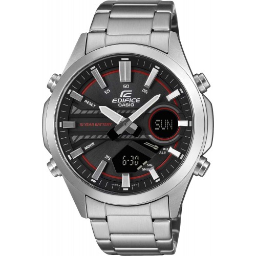 Кварцевые мужские наручные часы Casio EFV-C120D-1A с аналоговой + цифровой индикацией времени. Калибр механизма — 5699. Функциональность данной модели: формат времени 12/24, функция летнего времени (DST), мировое время в 30 городах (29 часовых поясов), вечный календарь до 2099 года, 3 независимых будильника, сигнал начала часа, секундомер с точностью 1/100 секунды и измерением до 23 часов 59 минут 59,99 cек., таймер обратного отсчета (диапазон времени 24 часа), записная книжка телефонных номеров на 30 записей, люминесцентное напыление на стрелках и метках (светятся в темноте). Батарейка на 10 лет работы. Водонепроницаемость WR100 (10 атм).
