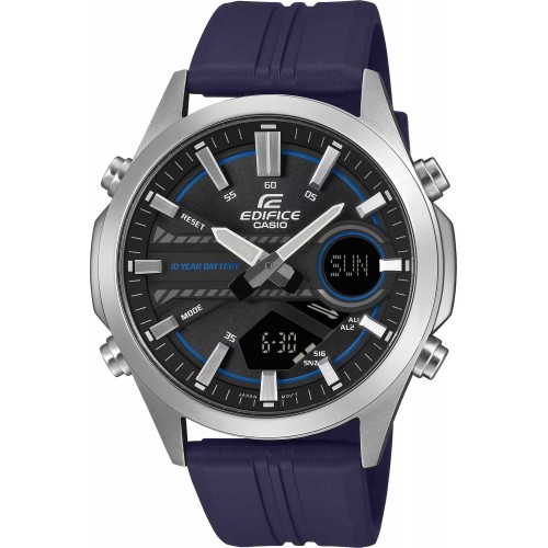 Кварцевые мужские наручные часы Casio EFV-C120P-1A2 с аналоговой + цифровой индикацией времени. Калибр механизма — 5699. Функциональность данной модели: формат времени 12/24, функция летнего времени (DST), мировое время в 30 городах (29 часовых поясов), вечный календарь до 2099 года, 3 независимых будильника, сигнал начала часа, секундомер с точностью 1/100 секунды и измерением до 23 часов 59 минут 59,99 cек., таймер обратного отсчета (диапазон времени 24 часа), записная книжка телефонных номеров на 30 записей, люминесцентное напыление на стрелках и метках (светятся в темноте). Батарейка на 10 лет работы. Водонепроницаемость WR100 (10 атм).