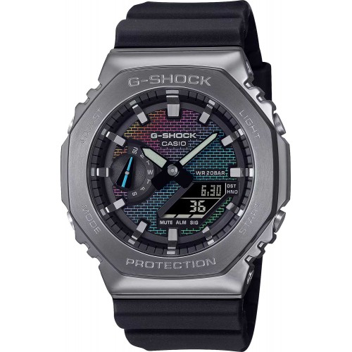 Эти мужские кварцевые часы сочетают аналоговое и цифровое отображение времени. Они оснащены двойной настраиваемой светодиодной подсветкой с функцией послесвечения (белый цвет, длительность 1,5 или 3 секунды). Среди полезных функций – мировое время (48 городов в 31 часовой зоне), точный секундомер (до 24 часов с шагом 1/100 сек) и таймер обратного отсчета (от 1 сек до 24 часов с автоповтором). Часы имеют автоматический календарь до 2099 года, переключаемый формат времени (12/24 часа), 5 будильников и ежечасный сигнал. Функция перемещения стрелок и отключение звука кнопок добавляют удобства. Ударопрочный корпус из серебристого полимера защищает механизм от повреждений. Безель выполнен из нержавеющей стали, а черный полимерный ремешок оснащен стандартной застежкой. Прочное минеральное стекло устойчиво к царапинам. Часы водонепроницаемы до 200 метров, что позволяет использовать их для дайвинга. Особый акцент – циферблат с дизайном, имитирующим радужную кирпичную кладку.
