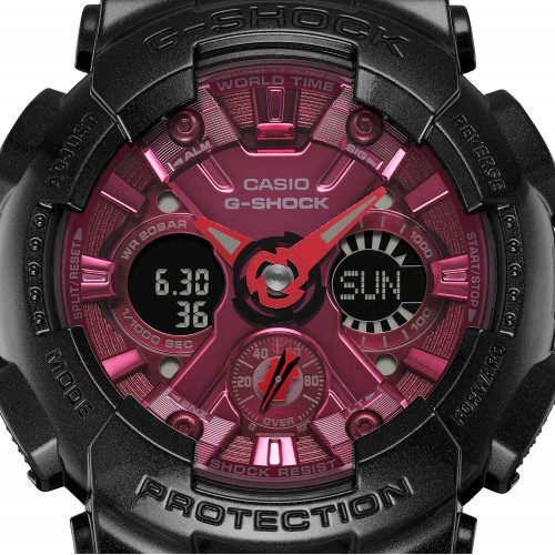 Casio GMA-S120RB-1A – это ударопрочные часы из коллекции G-Shock с комбинированным (цифровым и стрелочным) отображением времени. Они оснащены кварцевым механизмом (калибр 5518) и широким набором функций, включая мировое время, будильник, секундомер, таймер обратного отсчета, автоматический календарь и LED-подсветку с авто-активацией. Водонепроницаемость до 200 метров делает их идеальными для активного образа жизни.