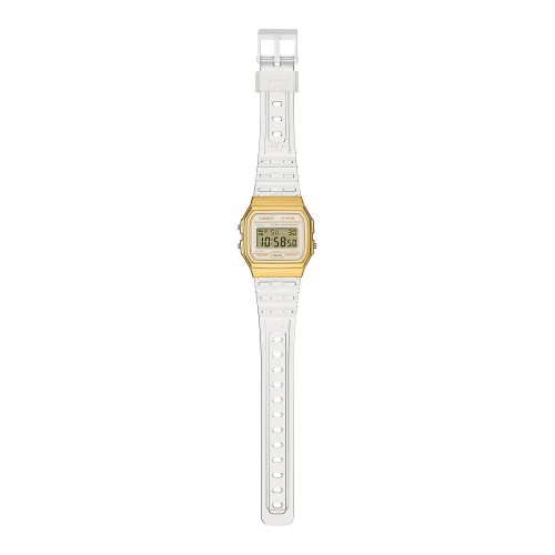 Женские электронные часы с подсветкой на светодиодах, зелёный цвет. Ежедневный будильник, сигнал каждый час. Секундомер с точностью измерения 1/100 секунды и пределом отсчёта до 1 часа. Режимы работы секундомера: прошедшее время, промежуточные отсчёты, результаты первого и второго места. Формат времени 12/24 часа. Автоматический календарь. Циферблат белого цвета. Корпус — из полимерного материала золотистого оттенка. Прозрачный ремешок из полимера, стандартная застёжка. Стекло — акриловое. Защита от воды — WR 30 (брызги). Вес — 21 г. Срок службы батарейки — 7 лет.