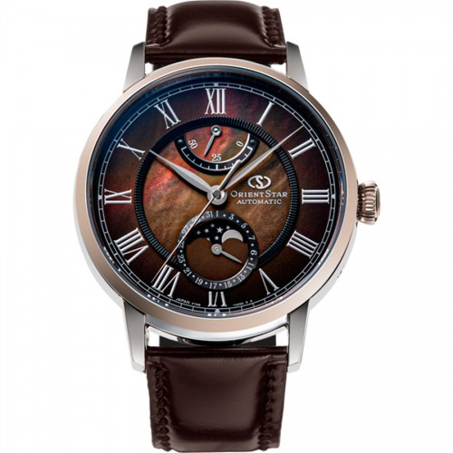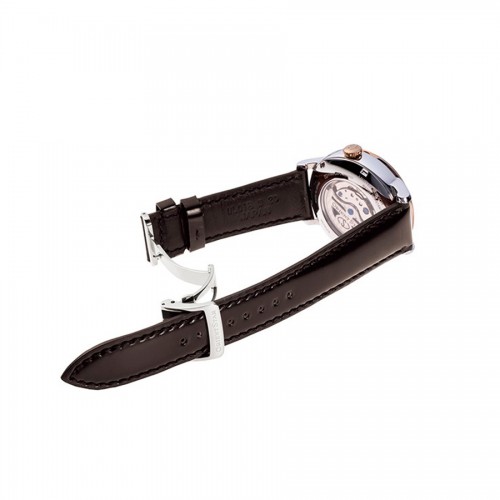 Механические часы с автоподзаводом и возможностью ручного завода. Запас хода на 50 часов. Индикатор запаса хода. Водостойкость WR 50. Центральные часовая, минутная и секундная стрелки. Индикация даты. Фазы Луны. Циферблат с часовыми индексами в виде цифр. Корпус выполнен из нержавеющей стали. Устойчивое к возникновению мелких механических повреждений сапфировое стекло. Прозрачная задняя крышка. Кожаный ремешок.