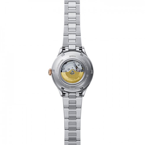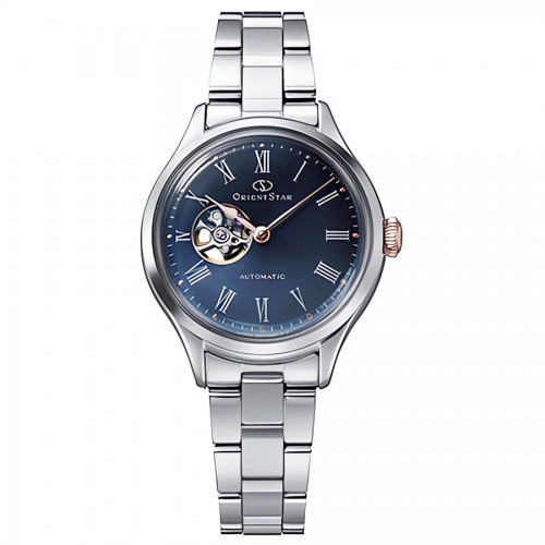 Женские механические часы с автоподзаводом (с возможностью ручного подзавода). Калибр механизма 55C22 на 20 камнях. Частота 21 600 полуколебаний в час. Запас хода 50 часов. Центральные часовая и минутная стрелки. Серо-синий градиентный циферблат с открытым балансом хода. Римская индикация времени. Круглый корпус выполнен из нержавеющей стали. Стальной браслет, раскладывающаяся застежка. Прочное минеральное стекло устойчивое к мелким механическим повреждениям. Прозрачная задняя крышка. Водостойкость WR 50 (мытье рук, дождь).