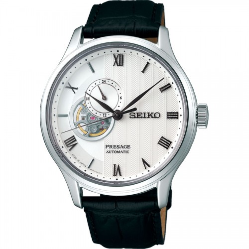 Мужские механические часы с автоподзаводом. Калибр механизма 4R39 на 24 камнях. Запас хода 41 час. Центральные часовая, минутная и секундная стрелки. 12/24 часовой формат времени. Белый циферблат с открытым балансом хода. Римская индикация времени. Круглый корпус выполнен из нержавеющей стали. Черный кожаный ремешок, стандартная застежка. Устойчивое к возникновению царапин сапфировое стекло. Водостойкость WR 30 (брызги).