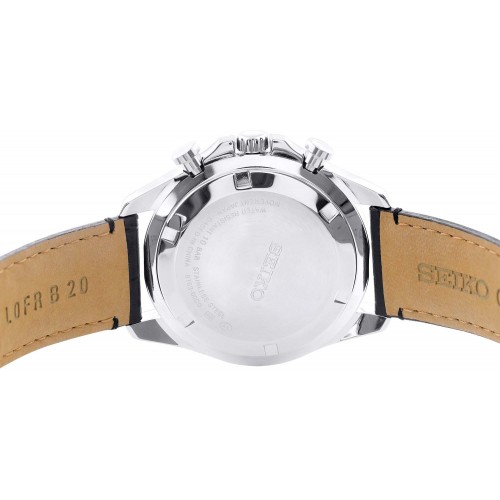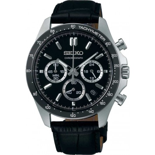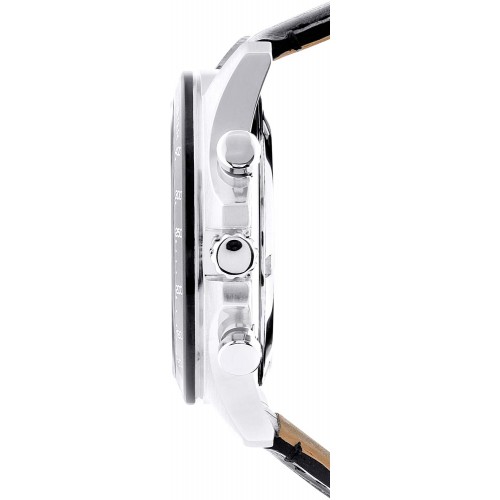 Кварцевый хронограф. Водостойкость WR 100. Часы, минуты, секунды. Индикация даты. Тахиметр. Стрелки и метки с люминесцентным покрытием. Циферблат с часовыми индексами в виде штрихов. Корпус выполнен из нержавеющей стали. Устойчивое к возникновению мелких механических повреждений минеральное стекло повышенной прочности Hardlex. Кожаный ремешок черного цвета.