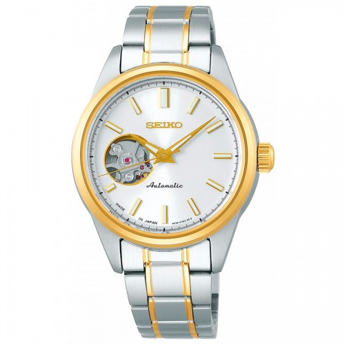 Женские механические часы с автоподзаводом. Калибр механизма 4R38 на 24х камнях. Частота 21 600 полуколебаний в час. Запас хода на 41 час. Функция остановки секундной стрелки. Центральные часовая, минутная и секундная стрелки. Серебристый циферблат с открытым балансом хода. Люминесцентные стрелки и часовые метки. Круглый корпус выполнен из нержавеющей стали с частичным PVD покрытием цвета желтого золота. Стальной браслет с частичным покрытием, раскладывающаяся застежка. Закаленное минеральное стекло Hardlex устойчивое к мелким механическим повреждениям. Водостойкость WR 100 (плавание без погружения).