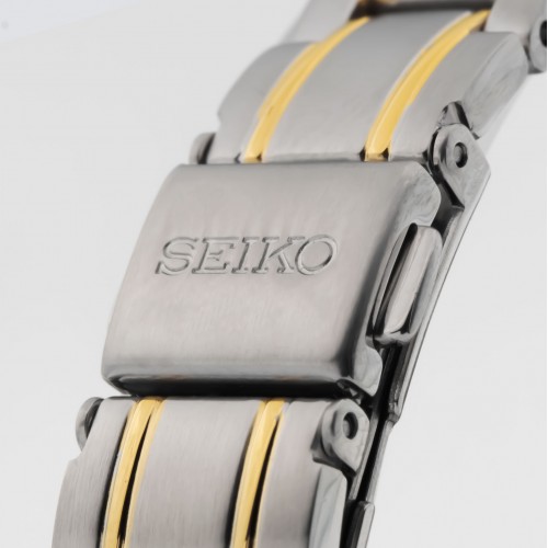 Женские кварцевые часы. Калибр механизма 6N22. Центральные часовая, минутная и секундная стрелки. Апертура даты в позиции 3 часов. Белый циферблат. Арабская индикация времени. Круглый корпус выполнен из нержавеющей стали с частичным PVD покрытием цвета желтого золота. Стальной браслет с частичным покрытием, тройная раскладывающаяся застежка. Устойчивое к возникновению царапин сапфировое стекло. Водостойкость WR 100 (плавание без погружения).